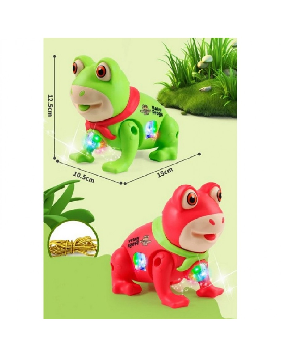 Когато се включи, жабката подскача, свети и свири весела мелодия,